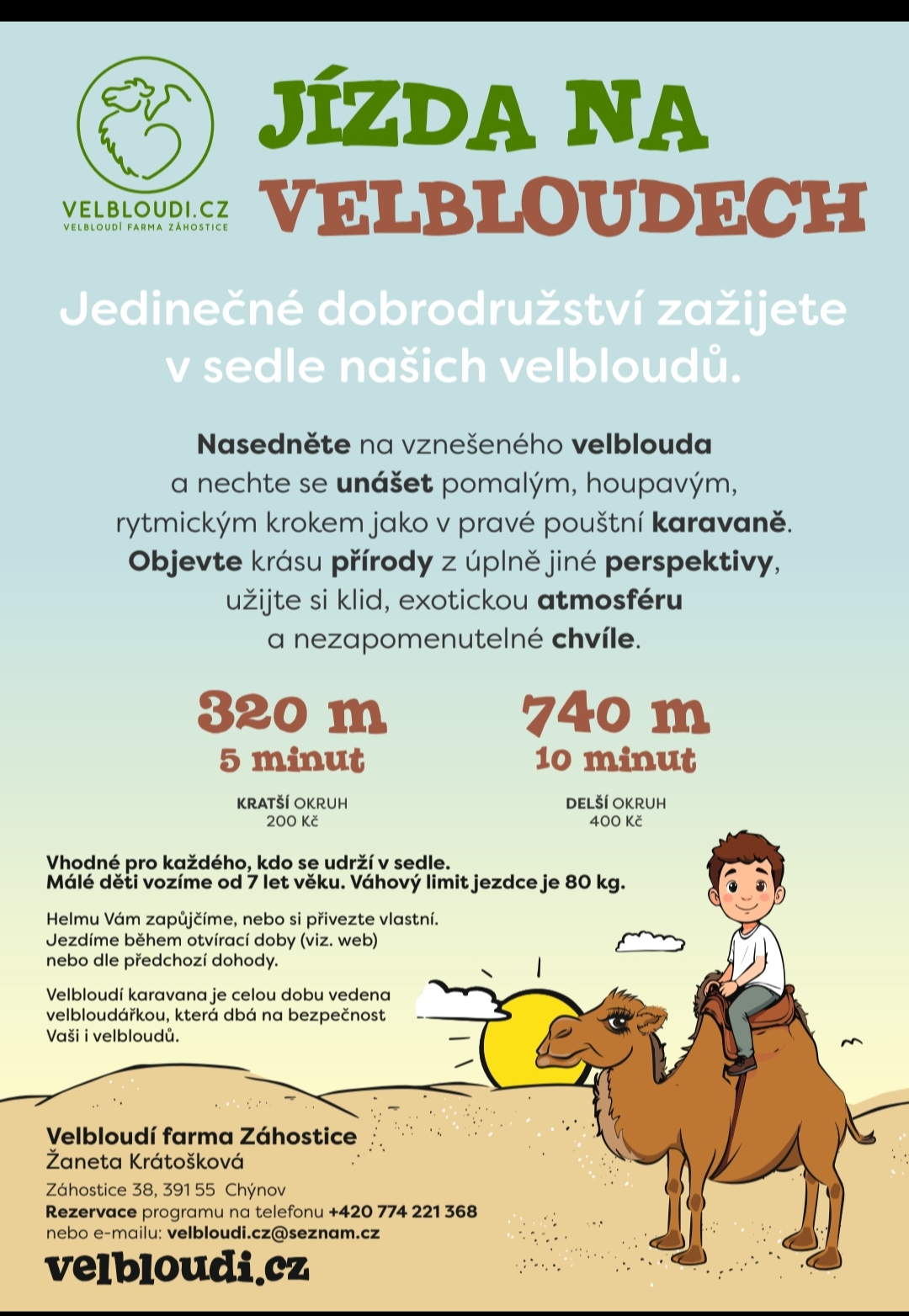 Jsme rodinná velbloudí farma v Záhosticích. Velbloudi jsou pro nás životní styl a rádi Vás na velbloudím statku uvítáme.