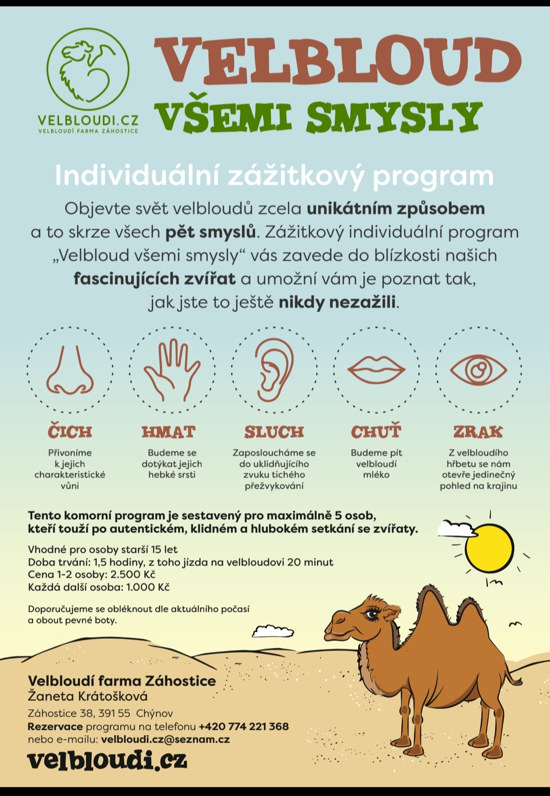 – na farmě se setkáte s velbloudy různého věku, od mláďat po důchodce, zvířata chovná i nechovná, kopající i kousající. Ale hlavně Vám představím velblouda jako úžasného parťáka pro život, kamaráda, mazlivou, citlivou a vyrovnanou bytost, zvíře vymyšlené k dokonalosti